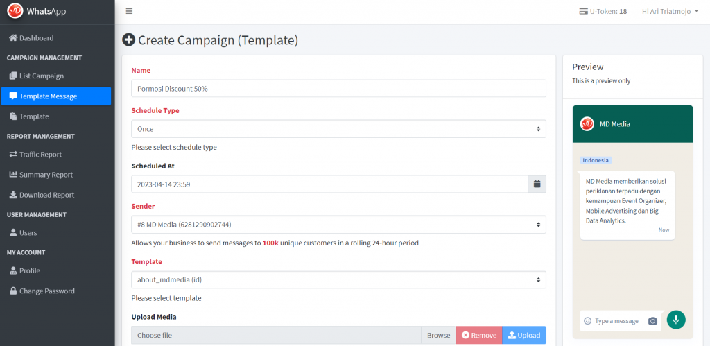 Satu waba bisa create 250 template (jika displayname dan greentick belum approve)